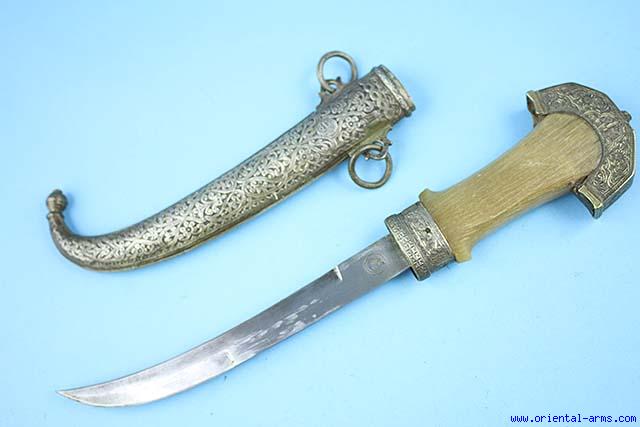 Up for sale is this very Fine Koumaya Dagger from Morocco, with a classical blade, 11 inches long, double edged at its lower half and single edged at the top. The blade is signed with an image of a human face. The handle is carved from a massive piece of Rhino horn. The pommel head and the scabbard are made of heavy silver, engraved and chased in a classical Moroccan design. and it is stamped in several place with a big silver proof mark. Total length 14 ½ inches. Very good condition. A very fine piece circa 1900 |