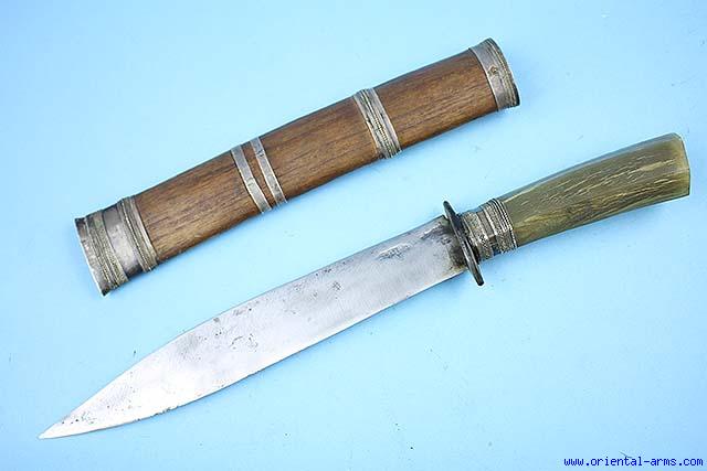 This Dah style heavy knife is most probably of Thai origin, mid 20C. Heavy thick blade 9 1/2 inches long. Solid horn handle with small horn cross guard and filigree silver collar. Wood scabbard bound with silver bands. Total length 14 inches. Very good condition. |