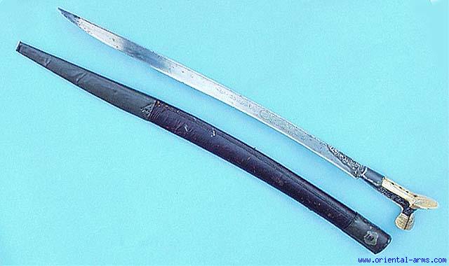 A nice example of a classical “YATAGAN”. The Yatagan derives its shape from very old blades. Its peculiar shaped blade has a down curving blade with reinforced spine, and it is found in many weapons in the eastern world from the West Balkan countries to the far Indian sub-continent. Its eared pommel shape is known from very old days and similar pommels were found in swords from Luristan 3000 years ago. This specific example is probably of West Turkey origin, has a 23 inches long blade inscribed and silver inlaid with Arabic letters and dated to 1223 to the Islamic calendar (1808) The grips with the side ears are elephant ivory and the grip strap and bolster are chased silver (with a later steel collar). Scabbard covered with leather with late metal mounts. . Total length (in scabbard) 31 ˝ inches. Good condition. Age cracks to the grips and later replaced metal mounts and grip collar. A very elegant example at a very reasonable price. |