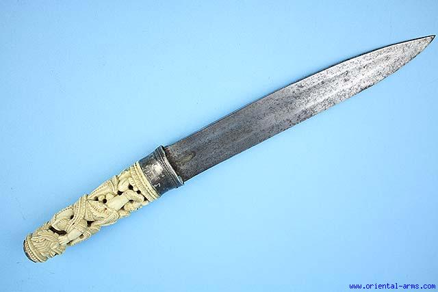This fine heavy knife is a version of a Dah, probably Burma, early to mid 19 C. The heavy down curving fullered blade is 9 1/2 inches long. The handle is finely carved from a single piece elephant ivory with a silver collar. Total length 15 1/2 inches. Very good condition. Good age patina on the ivory. No scabbard. Fine and impressive item. |