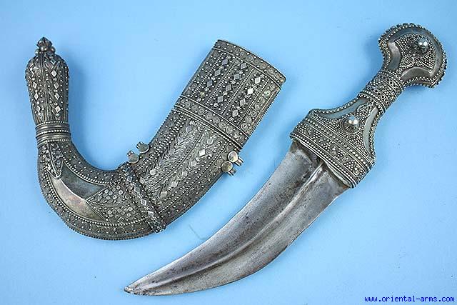 This large and heavy silver mounted Jambiya dagger is coming from Taiz in Yemen, second quarter of the 20th C. Classical shaped curved blade8 inches long with a pronounced central rib. Heavy silver handle and scabbard with uprising tip. Arabic inscription, probably of the owner name on the back side of the handle. Total length 16 inches. Very good condition. |