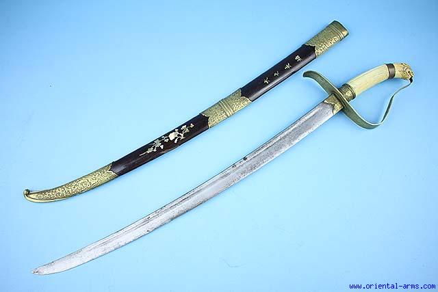 Up for sale is this very good Vietnamese saber also known as Guom. The single edged massive and fullered blade is slightly curved 23 inches long. The hilt is composed of bone grip with ivory lion head pommel and engraved brass cross guard and D guard. The scabbard is wood with finely chased brass fittings and inlaid with Mother of Pearl inscription and decoration. Total length 32 inches. Very good condition. Minor chips on the ivory pommel. |