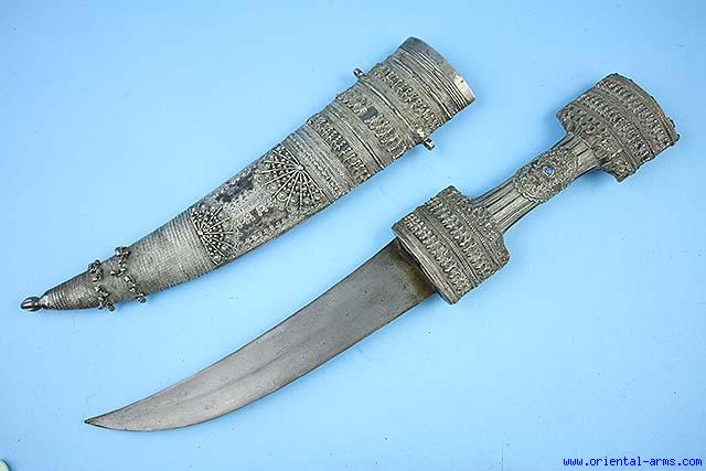 A dagger of fine quality and decoration, of Turkish origin, most probably from East Turkey, with strong Kurdish / Iraqi influence. Late 19 Century. Very good 9 ½ inches curved blade forged from Sham (Low contrast wootz) steel. Dark wood hilt mounted with silver collar, pommel and grip strips and a central grip medallion set with turquoise stone. The scabbard is whole silver on wood, rich in filigree decoration. Maker (or owner) name is soldered in silver wire to the back of the scabbard. Total length in scabbard 21 inches. Very good condition. A fine piece. |