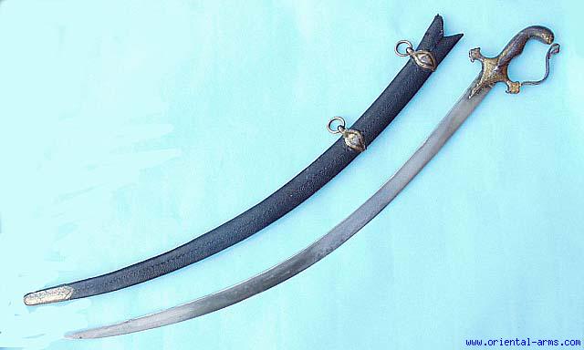 This superb and attractive Shamshir is of Indian origin, probably mid 19 C. The curved wootz blade is 31 inches and of real wedge shape cross section. Steel hilt with a pommel styled as animal head and so is the D guard. Fine leather covered scabbard with gold koftgari decoration. Total length 36 inches. Very good condition. Only part of the gold koftgary on the handle is worn. A fine sword for the connoisseur collector. |