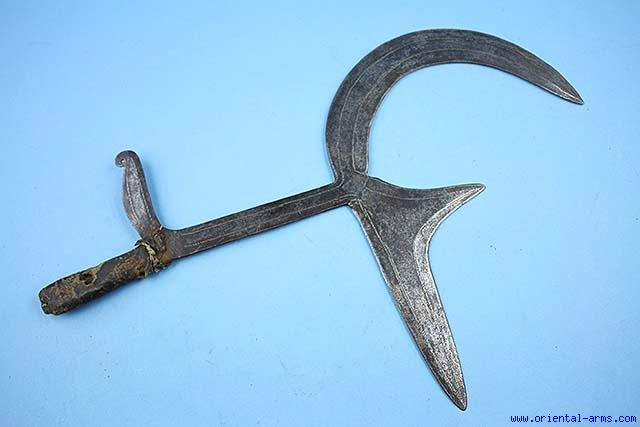 This type of throwing knife is associated with the group of tribes belonging to the Ngbaka people, mostly residing in Zaire. It is characterize by the Sickle shaped main blade and two straight side blade the upper one being bigger and wider. This very good example is a rather large one, 21 inches long and about 14 inches wide. Very well forged and well decorated with geometric line design. Handle with the original leather cover. Very good condition. Early - mid 20C. |