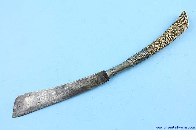 Up for sale is this small knife, from Thailand, late 19 C. this knife was most probably used to cut betel nuts. Blade 6 inches long. Finely carved ivory handle with long silver collar. Total length 12 inches. Very good condition. Good age patina on both the blade and the handle. |