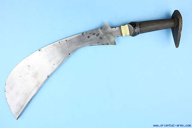 The Ayda Katti is the national sword of the Coorg of Malabar, the South West coastal area of India. It is one of the rarest swords in the Indian arsenal and of a very peculiar shape. It reminds in a way an agricultural tool, but it is a real weapon and a deadly one in the experienced hands. The blade of this one is of a sickle shape 17 inches long and 4 inches wide at its widest point with a massive brass bolster. The handle is carved horn checkered around the grips area, with a kite shaped horn pommel. 23 inches total length. Very good condition. |