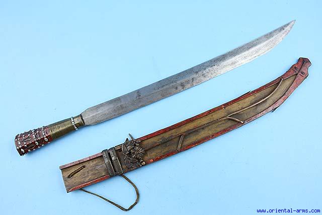 A knife of the Taiwanese people - a very fine example of a very rare knife. The single edge blade is 19 inches long half diamond cross section. The handle is wood, painted red with heavy brass bolster, brass wire binding. and round and oval metal inserts. black and gold and set with metal strips and round inserts. The sheath is wood half open with brass strip and decoration holding the blade in position. Back side of the scabbard is painted red. Total length 26 inches. Very good condition. A fine and rare mid 19 C. Authentic knife. |
