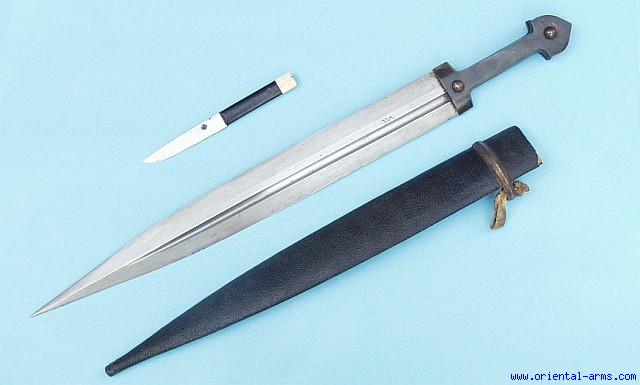 We offer for sale this fine Kidjal dagger , in excellent shape and condition, complete with a by-knife (quite rare). The massive heavy blade is 18 inches long, deadly sharp, with off-set central fullers, signed with Arabic letters. The grips are horn, riveted to the blade tang. Wood scabbard covered with black leather on the front side and brown leather on the rear side. The back compartment includes a by-knife, of 3 inches blade stamped with a maker sign, with horn / bone combination handle. Total length (in scabbard) is 23 inches. Very good condition. There is a crack in the tang on one side going almost to the other side, but the handle is very solid.Minor damage to the leather at the scabbard mouth. Unusual find with the small original knife. |