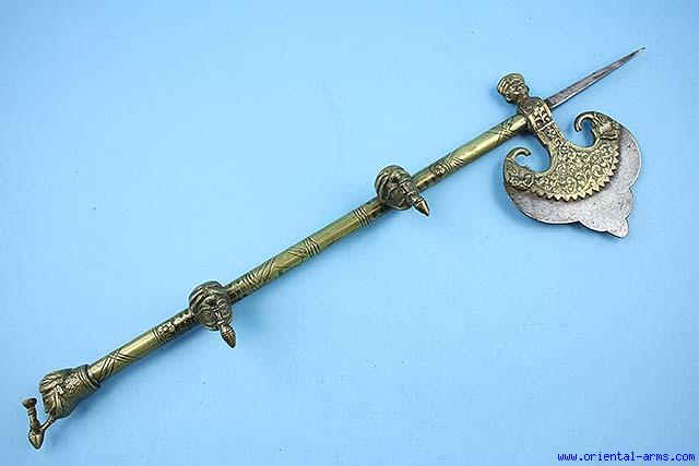 This battle axe is Indian first half of the 20C. Mostly of ceremonial nature but can be used also as weapon. 5 inches steel blade set in a cast brass bolster. 4 1/2 inches steel spike. 17 1/2 inches cast brass handle set with human figures. Very good condition. |