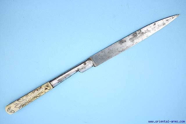 This big Folding knife is French, 19 C. (Probably 1876), with a heavy blade 10 inches long, well forged and marked VERITABLE BERNARD 76 . The handle is steel with engraved bone grips. Total length 19 inches (fully open). Very good condition.