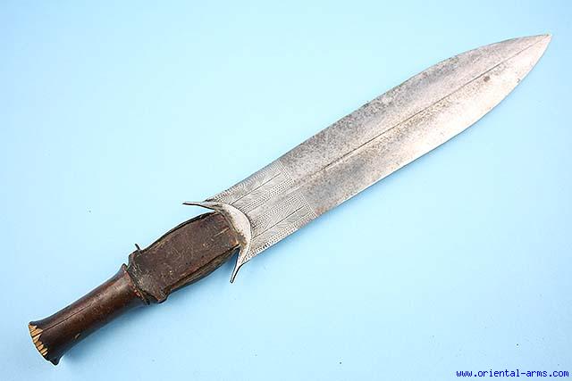 A sword of the Fang people residing in the borders area of Gabon and Cameroon. Weapons of the Fang are somewhat different and they are much sought after. This one is old, probably late19th Century. Collected by Dr. Yves Bellocq between 1922 and 1928. 13 inches double edge blade with a flat central rib and lightly engraved at its upper part . Hardwood, cross-shaped hilt with good age patina with wooden langets. No scabbard. Total length 20 inches. Very good condition. Minor wood chips. very reasonable price. |
