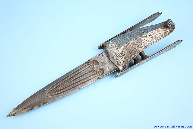 A version of the famous Kattar (Katar). A development stage between the Pata, the long gauntlet sword and the Kattar, the short push dagger. Finely fullered blade 10 inches long. The side bars and the hood are finely chiseled with floral scenes and bird and a styled monster head shaped tip. 17 inches total length. Very good condition. Minor blackened spots on the blade. Hood is very slightly inclined to one side. |