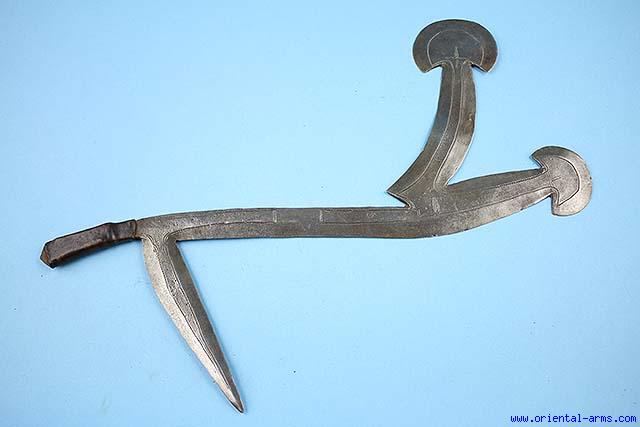 This rare type of throwing knife is associated with the group of tribes belonging to the Banda people, mostly residing in the republic of central Africa. It is characterized by the kidney shaped disks at the tips of the blades. This one is 16 inches total length, with the handle bound by the original leather. Very good condition. Early 20 C. For a very similar knife, see P. Westerdijk; The African Throwing Knife group IX, type 10. |
