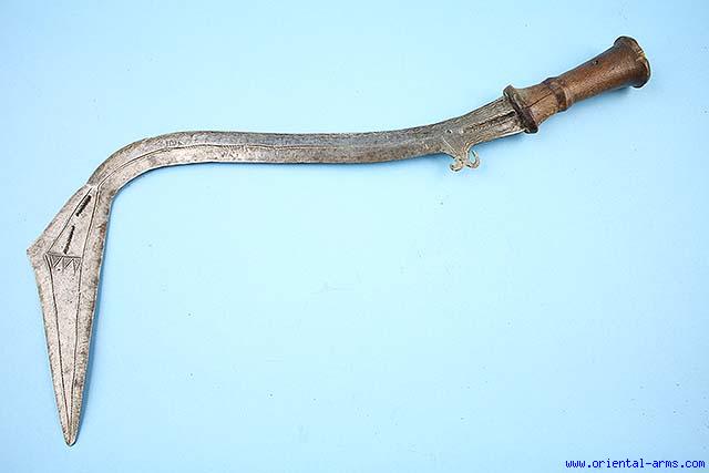 This rare form of saber knife comes from the Banda people residing in the republic of Central Africa. Although it can be a functional weapon it is mostly used by young female for dancing ceremonies. Nicely forged blade, decorated with punched geometrical design. Wood handle. Length 17 1/2 inches. Rare knife. For a similar one see Peter Westerdijk AFRICAN METAL IMPLEMENTS #96 |