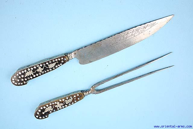 This fine carving set, probably used in hunting is German, prior 1800. Knife and fork of similar structure and decoration. The blade is etched with inscription. The grips are ebony set with white metal and Mother of Pearl inserts and engraved white metal grip straps. Blades 6 1/2 and 7 inches. Total 10 1/2 and 11 inches. Very good condition |
