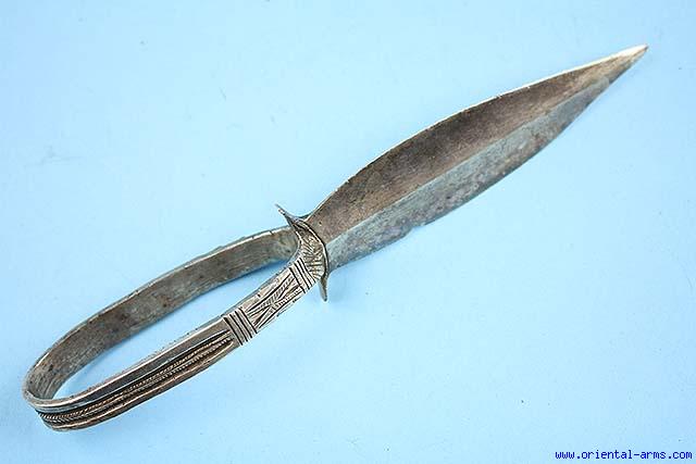 This loop dagger is used by the TIV people residing on the Niger river in Nigeria. Very typical whole steel construction with the ring hilt forged in one piece with the blade. This unusual piece is plated with thick silver layer, probably an item belonged to a high ranking person of the tribe. Spear head shaped 5 1/2 inches long blade with flat hollow ground cross section and a central rib. Filed and chiseled ring handle. Total length 9 1/2 inches. Very good condition. An old edge nick. Quite unusual and very elegant piece. |