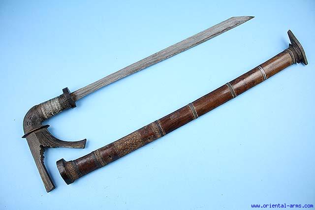 Up for sale is this rare and fine Sumara sword from Sulawesi with a 19 inches Pamor steel blade. A large down curving engraved horn handle with forked pommel. Original and complete wood scabbard, partially carved, with horn mounts, bound with braided rattan bands (One missing). Total length 29 inches. Very good plus condition. Late 19C. For a similar sword see A.G. Van Zonneveld TRADITIONAL WEAPONS OF THE INDONESIAN ARCHIPELEGO Page 131, fig. 544. A Fine rare and complete sword |