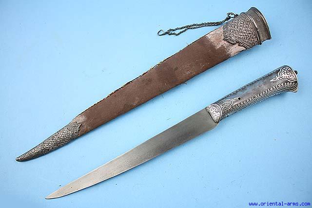 This Kard knife is Indian, mid - late 19 C. Finely forged wootz blade 8 1/2 inches long. Good high contrast wootz pattern. Steel handle with heavy silver koftgari decoration. Original wood scabbard with velvet cover and chased silver mounts. Total length 14 1/2 inches. Very good condition. |