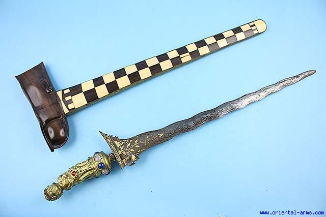 This fine Keris dagger is coming from Bali, Indonesia. Early blade, late 19 C - early 20C. with later, mid 20C. mounts. Wavy blade 18 inches long of very good Pamor structure, decorated with gold inlay (True inlay) decoration. Gilded handle in the shape of a mythological creature set with colored stones. Gilded mendak also set with colored stones. Finely grained wood scabbard decorated with checkered design of wood / ivory and chased brass back side. Total length 27 inches. Very good condition. Very few small stones are missing from the handle. Minor losses to the gold inlay. Fine impressive keris. |