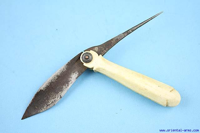 The origin and use of this type of folding knives is not very clear and there are numerous suggestions ranging from knives to clean opium pipes to knives for cutting and inscribing on palm leaves. The origin is most probably from the Indo-China area. It has a 3 inches blade, hollow ground, 3 inches back spike with silver plated strip o the spine. Ivory handle. 6 inches fully opened. Very good condition. |