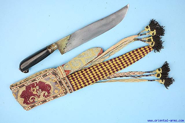 This knife is coming from Bukhara, Uzbekistan, also known as Pichaq. Mid 20 C. 8 inches blade, carved wood handle with styled bird shaped pommel set with colored inserts. Typical Bukhara embroidered colorful fabric scabbard and belt attachment, with a second compartment for a small knife (now missing). Very good condition. The knife and scabbard probably were not born together but fits well and aged about the same. Very interesting set. |