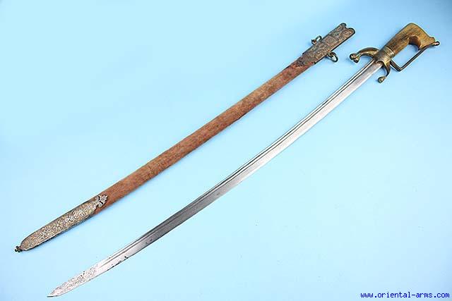 Up for sale is this fine Nimcha sword, Morocco, 19 C., slightly curved and finely fullered blade, 32 inches long. Massive rhino horn handle with gilded steel knuckle guard and cross guard. Fabric covered scabbard with chased and gilded locket and chape. Total length 40 inches. Very good condition. Minor shallow pitted spots near the blade tip. Minor losses to the gilding. |
