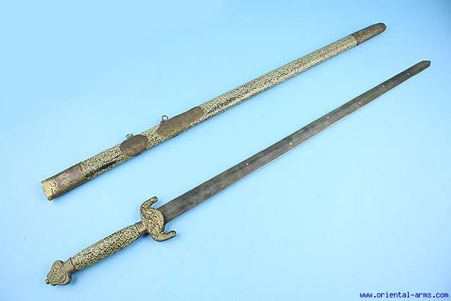 Up for sale this Chinese straight sword Jian from the early - mid 20 C. The straight blade of flat diamond cross section is 28 inches long with the seven brass inserts “stars”. Wood grip with dyed ray skin cover, beautifully chased brass fitting on a wood scabbard covered also with dyed ray skin. Total length 39 inchesVery good condition. Minor losses to the ray skin |
