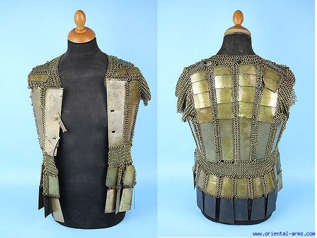 Up for sale this complete Moro Armor from the Philippines. Mid 20C. The armor is constructed from brass plates connected with brass rings, with two brass buckles on the chest plates. 26 inches High 21 wide. Good condition. Several plates are repaired. Rings missing in several areas. The lower raw of plates is a later addition. Very law price. An excellent item for study and/or restoration project. |