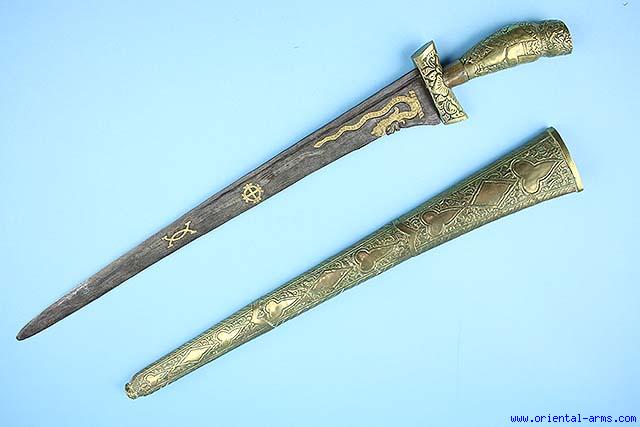 The Pedang Lurus is an Indonesian short sword, common in Java but can be found also in other Indonesian islands. This one is of somewhat unusual. Whole brass construction. Heavy and massive pamor blade with gold (?) inserts depiction the naga (Snake) head. 19 inches long straight with a slightly down curving double edge tip. The hilt and scabbard are whole chased brass. Total length 25 inches. Very good condition. Very good although a bit late item, dated probably to the second half of the 20 C. Impressive sword. |