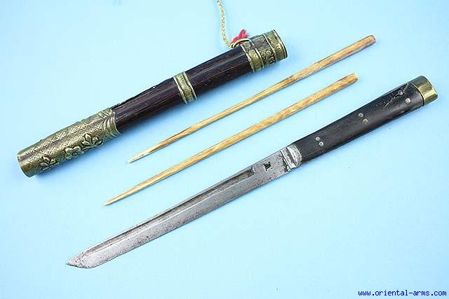 A Chinese ‘trousse’ (eating set), comprising a knife and chopsticks. This type of sets was very common in china and in all the countries under the Chinese influence from Tibet to Mongolia. It was part of a man formal dress up to the turn of the 20th century and usually accompanied with a variety of accessories like pickle spear, toothpicks, tweezers and the like. Similar sets are found in various sizes and quality. This one is a very good exemplar. The blade is heavy, nicely fullered, 5 inches long , very well forged and signed with a deep maker mark. Hardwood grip with steel bolster and brass pommel cap. Wood scabbard with chased brass mounts. Ivory chopsticks with good age patina. Total length 11 inches. Very good condition. Age cracks on the wood parts. Authentic and original early 20C. set. |