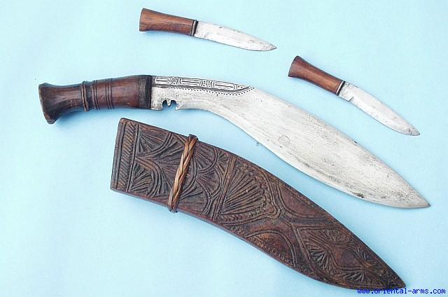 The KHUKURI is the traditional weapon of the Gurkha people from NEPAL. It is an every day tool used for hunting, agriculture, defense and fighting, and every man in Nepal is proud to carry one for use and as a symbol of status. It derives its shape from the “KOPIS” the ancient Greek sword. This specific example is dated 1933 (see below). It is constructed in the manner known as BOX scabbard, where the main blade and the accompanying knives are housed in a scabbard made entierly of wood and bound with a braided rattan band. It has a heavy down curving blade of 11inches long, well forged. The hilt is dark wood. The scabbard is wood elaborately carved on its front face. The compartment for the two by-knives is an integral part of the scabbard, and both are included. The scabbard and the grip are both marked on their side TCBG 1933. Total length 15 inches. Good condition. Few old sharpening signs on the edge and a small chip on the pommel wood. |