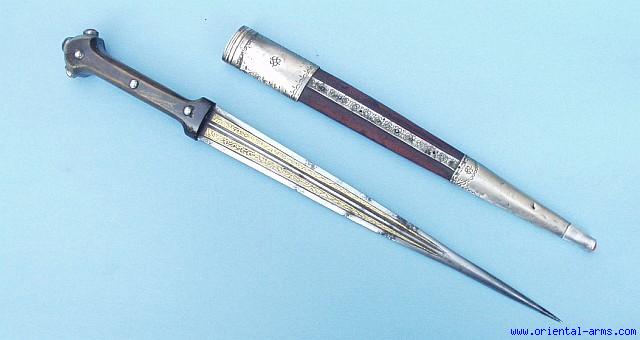This superb dagger is also known as Ottoman Court Dagger. it was a side arm of the nobilities visiting the courts of the Ottoman empire in the 17 and 18 C. The blade is 11 ½ inches long with a central rib tapering to an acute tip with a thickened tip and decorated with gold koftgari design with the Islamic year of 1135 (1722). The grips are horn riveted to the tang with three silver capped rivets and set with three stones on the pommel. The grip strap is engraved silver. the scabbard is wood covered with its original dark red fabricand original central strap. The locket and chape are old but later to the scabbard. The scabbard tip is set with recent stone setting. Total length (in scabbard) 17 inches. Very good condition to its age. Few pitted spot on the blade edge. Very small chips to the grip horn slabs. |