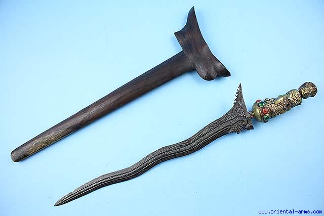 This Keris dagger is coming from Bali, Indonesia, mid 20 C. The 17 inches blade is forged from very good high contrast polished pamor stee with a Naga (Snake) chiseled into the blade. Wood scabbard. Cast brass handle in the shape of a mythological creature set with colored stones. Classical shape ring mendak also set with colored stones. Total length 25 inches. Very good condition. Very attractive item. |