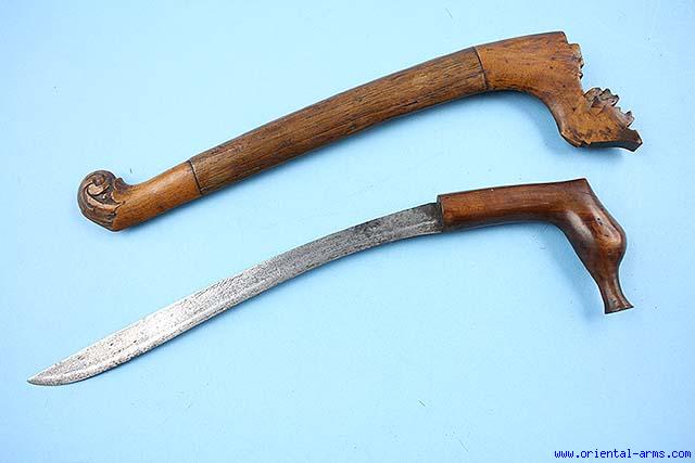 A small but well made Sekin I knife / Dagger from Sumatra, Indonesia. 8 ½ inches down curving blade. Wood hilt in a shape of a styled bird. Wood scabbard. Total length 13 inches. Very good condition. Good age patina on the blade and on the wooden parts. A scarce knife. Late 19C. For a similar one see Van Zonneveld TRADITIONAL WEAPON OF THE INDONESIAN ARCHIPLAGO p 119 fig 465 |