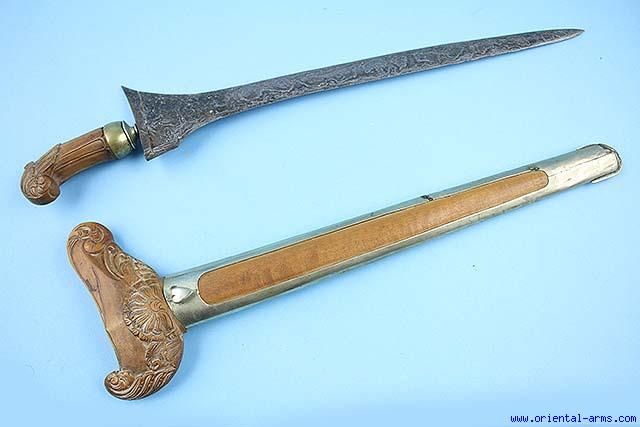 This Keris dagger early 20 C. with a massive straight pamor blade 14 inches long. The scabbard and handle are Java style with finely carved handle and scabbard top. White metal cover. Total length 18 inches. Very good condition. |