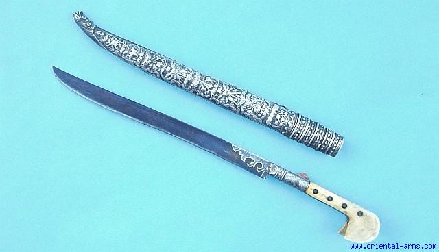 We offer for sale this nice short Yatagan with a 12 inches straight blade dated 1229 ( 1813). Ivory grips and silver strap with Niello design. There is Arabic inscription on the silver bolster top side. Embossed silver scabbard in typical 19 C. Ottoman style. Total length (in scabbard) 19 ½ Inches. Very good condition. Good patina on the blade with minor spots of light pitting. Probably of Turkish origin, this is a very good complet item, all authentic. |