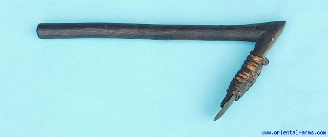 This Azde / Axe is coming from Papua / New Guinea. It has a short massive blade 4 ½ inches long, half of it is slotted and bound in rattan strips into the arm of an L shaped haft 14 X 7 inches long. Very good condition. An authentic and genuine tool/weapon from an exotic part of the world. |