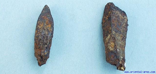 A pair of steel arrow heads from a cross bow, probably 16 C. Central Europe. Excavated condition.