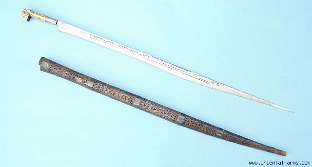 We offer for sell this Flyssa, the traditional sword of the Kabyles people of Morocco. These type of swords come with blades of various sizes from 12 up to 38 inches. This one is rather long and heavy 36 ½ inch long, with a 31 ½ inches blade. It is single edge widening to its maximum about 13 inches from the tip. The blade is nlaid with brass decoration. The hilt is a combination of steel and wood covered with engraved brass in a styled animal head. The scabbard is wood, carved in a classical local style and bound with brass bands. Very good condition. There is a crack 3 inches long at the top of the scabbard. This is a real and very impressive fighting weapon, quite rare at these dimensions and with the original scabbard. Probably from the early 20 Century. |