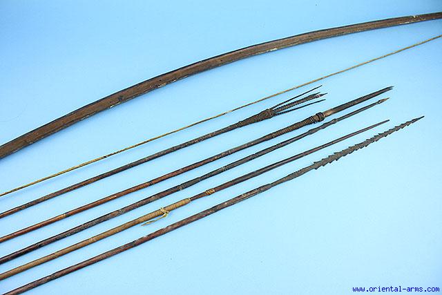 This wood bow is 66 ½ inches long, made of black palm. It is coming from the North Coast of the Sepik area around Aitape, Papua – New Guinea, early – mid 20 C. Original bamboo string. This bow comes with five various arrows with single, triple and four tips for fishing, mounted on bamboo hafts. Length of the arrows 42 -56 inches. Very good condition. Some age cracks on the arrows shafts.