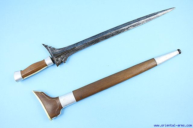 This Dagger is composed of a fine Bali keris blade mounted in a modern setting. Straight, late 19C. blade 17 inches long of fine pamor structure. 20 C. wood and bone handle and scabbard with Aluminum mounts. Total length 23 1/2 inches. Very good condition. |