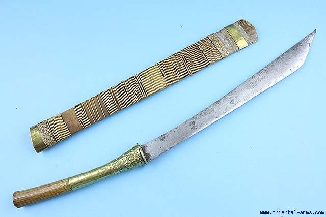 We offer this short sword Dah probably from a Lao origin mid 20C. More than 16 1/2 inches blade, edge widening and abruptly rising toward the tip. 9 inches long wood handle with chased brass mounts. Original wood scabbard with rattan binding and brass mounts. Very good condition. |