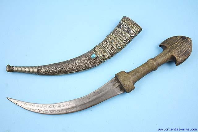 A very good typical Jambiya dagger from Iraq, most probably from the South. Late 19C. The sharply curved blade is 9 inches long, with a central rib. The hilt is carved from a solid piece of water Buffalo horn with a flared pommel. The scabbard is chased silver set with turquoise stone (many missing). Total length 16 inches. Very good condition. Minor dents to the silver. |