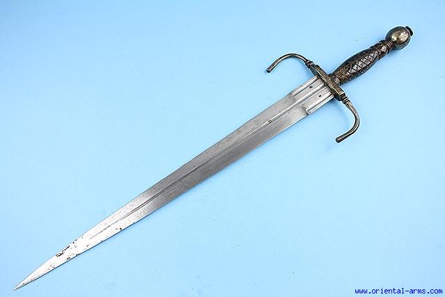 This is a fine 19C. copy of a 16C left hand dagger. Fine fullered long blade 19 inches long signed with a maker mark. Horn grip with a ball shaped steel pommel. Cross guard with down curving quillons. Total length 26 inches. Very good plus condition. Newly made scabbard (Not shown). |