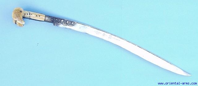 A nice example of a classical “YATAGAN” from the Balkan. The Yatagan derives its shape from very old blades. Its peculiar shaped blade has a down curving blade with reinforced spine, and it is found in many weapons in the eastern world from the West Balkan countries to the far Indian sub-continent. Its eared pommel shape is known from very old days and similar pommels were found in swords from Luristan 3000 years ago. This specific example is of Balkan origin, has a 25 inches long blade decorated with silver koftgari decoration and dated to 1284 (1867). The grips with the side ears are carved from walrus ivory. The grip strap and the blade collar fittings are made of brass with filigree work. Good condition. The grips are unfortunately cracked but hold very solid. No scabbard. |