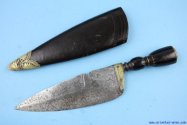 This Curios knife is most probably Spanish (Or Prtuguese), Late 18C - early 19C. Short wide massive blade 8 inches long with a 5 inches back edge. Brass bolster. Turned wood and brass handle. Newly made scabbard with pierced brass chape (may be original). Total length 13 inches. Good condition to age. Lightly pitted blade. |