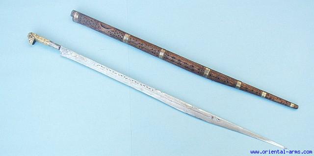 We offer for sell this Flyssa, the traditional sword of the Kabyles people of Morocco. These type of swords come with blades of various sizes from 12 up to 38 inches. This one is rather long and heavy 36 ½ inch long, with a 31 ½ inches blade. It is single edge widening to its maximum about 13 inches from the tip. The blade is inlaid with brass decoration. The hilt is a combination of steel and wood covered with engraved brass in a styled animal head. The scabbard is wood, carved in a classical local style and bound with brass bands. Very good condition. This is a real and very impressive fighting weapon, quite rare at these dimensions and with the original scabbard. Probably from the early 20 Century. |