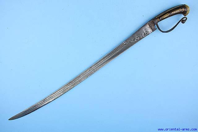 Up for sale a very nice and rare early Indian short sword. It has a rare wood handle inlaid with engraved bone sectors. The single egded blade is 26 inches long with steel bolsters and crossguard. This sword is very early probably late 17c or early 18th century. The work on the handle is typical to wood inlay work on other objects made in Vizianagaram. Vizianagaram is located in the east cost of India and was a center of art works in the 17 and 18 century. |