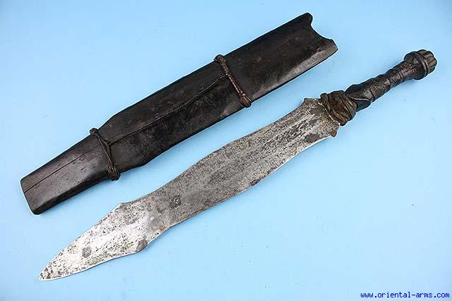 The Salampasu, a tribe of fierce warriors residing in southern Zaire are carrying this unique sword, somewhat different from the weapons of their many neighbors. A very nice photo of a Salampaso warrior carrying such a sword can be seen on the front cover of: Beaute Fatale the catalog of an exhibition of African weapons in Brussels, Belgium, 1992. The blade of this specimen is 16 inches, massive and well forged. The grip is beautifully carved blackwood bound with braided fibers with nicely carved pommel. The scabbard is also blackwood bound with rattan bands. Total length 24 inches. Very good condition. Blackened spots on the blade. Early 20 Century authentic and rather scarce sword. |